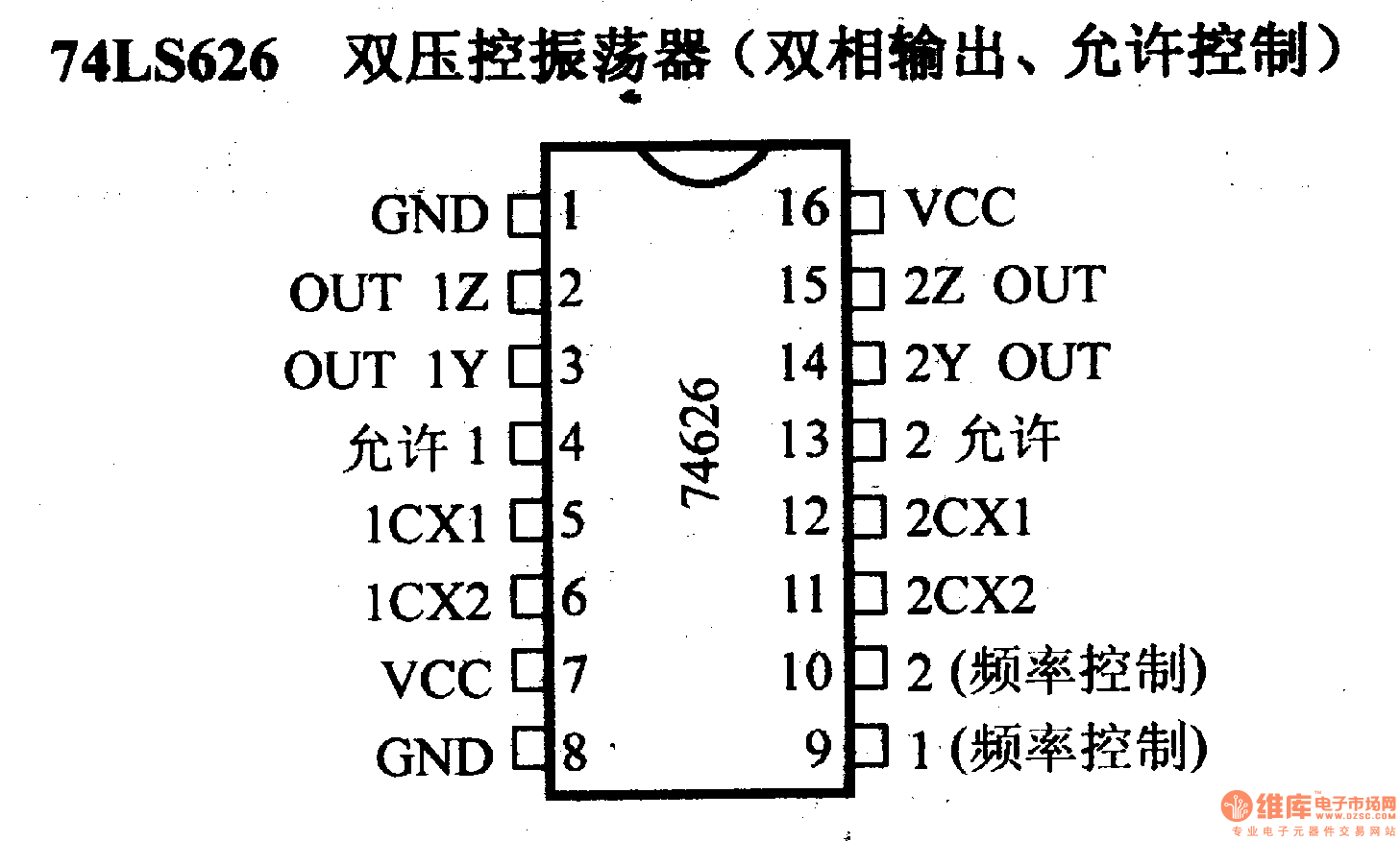 629是六種使用比較方便的vc()集成電路。主要以器件內(nèi)含vco數(shù)量、是否雙向輸出(除y輸出引腳,有的帶z輸出引腳)、有無使能端、有無頻段轉(zhuǎn)換、是否溫度補(bǔ)償?shù)茸鲄^(qū)分。表3是74ls5624—74ls629詳細(xì)的功能區(qū)分。表3 74ls624-74ls629詳細(xì)的功能區(qū)分 型 號 內(nèi)含vco數(shù)量 雙向輸出(帶z輸出引腳) 使能端 頻段轉(zhuǎn)換引腳(rng) 溫度補(bǔ)償端 74ls624 1 有 有 有 無 74ls625 2 有 無 無 無 74ls626 2 有 有 無 無 74ls627 2 無 無 無 無 74ls628 1 有 有 有 有 74ls629 2 無 有 有 無 根據(jù)各器件資料以及前面設(shè)定的fo=1.4mhz~19.998mhz,可以選用74ls628/74ls624。圖6是其引腳排列和功能簡介,注意74l$628的11、12腳標(biāo)注為rx,用于外接溫度補(bǔ)償電阻rext。而74ls624的1l、12腳是懸空腳(nc)。 分析壓控振蕩器74l5628/72ls624